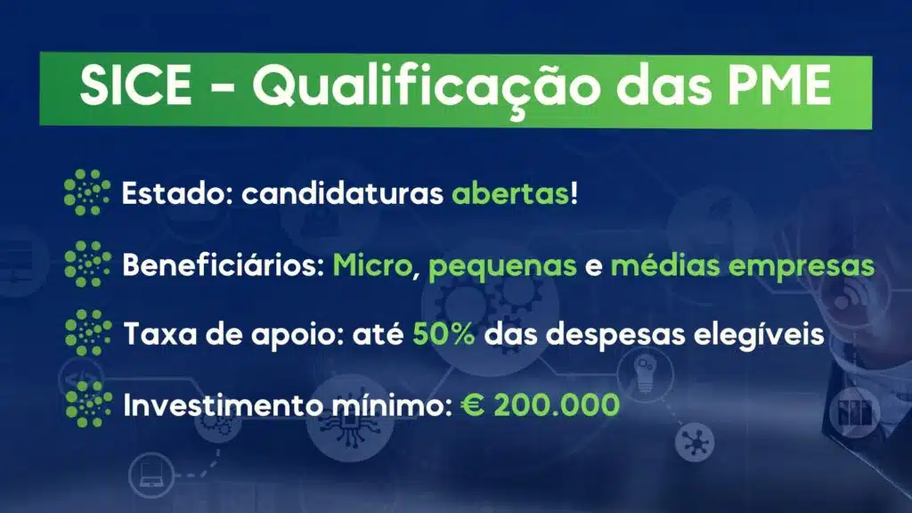 O SICE – Qualificação das PME é um concurso do Portugal 2030 desenhado para ajudar as empresas a ampliarem o seu perfil tecnológico, adaptando-as aos desafios da Transição Digital e da Transição Climática. A dotação é inferior à do anterior Quadro Comunitário, ainda assim, são 18 milhões de euros para investimentos imateriais como, por exemplo: